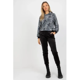 Velurová souprava sestávající z mikiny a kalhot. Halenka se zvířecím potiskem, dlouhými rukávy a kapucí. Klokaní kapsa na přední straně. Dlouhé kalhoty s nakládanými kapsami.