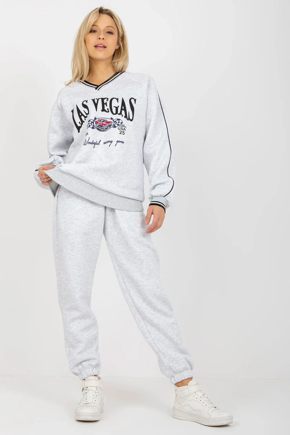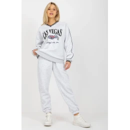 Tepláková souprava sestávající z mikiny a kalhot. Halenka s dlouhými rukávy a výstřihem do V. Dlouhé kalhoty se zavazováním v pase a nakládanými kapsami.