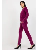 Velurová souprava sestávající z halenky a kalhot. Halenka s dlouhými rukávy a kulatým výstřihem. Dlouhé kalhoty se zavazováním v pase a nakládanými kapsami.