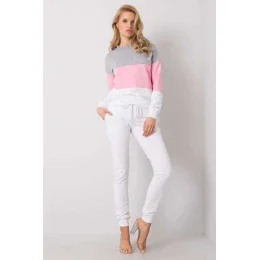 Tepláková souprava sestávající z mikiny a kalhot. Halenka s dlouhými rukávy a kulatým výstřihem. Mikina z látky ve třech barvách. Dlouhé kalhoty s pružným pasem, stahovací šňůrkou v pase a nakládanými kapsami.