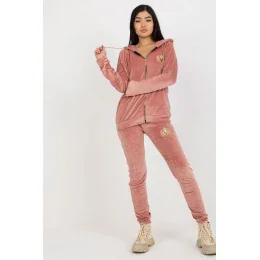Dámská velurová souprava sestávající z mikiny a kalhot. Halenka s dlouhými rukávy a kapucí. Dlouhé kalhoty se zavazováním v pase a nakládanými kapsami. Sada zdobená zajímavou výšivkou.
