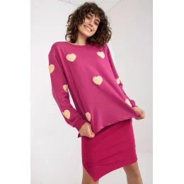 Ležérní dámská souprava sestávající z halenky a šatů. Volná halenka s dlouhými rukávy a kulatým výstřihem. Šaty vypasovaného střihu s ramínky z žebrované látky.
