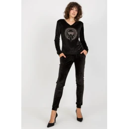 Velurová souprava sestávající z halenky a kalhot. Halenka s dlouhými rukávy a serpentinami. Dlouhé kalhoty se zavazováním v pase a nakládanými kapsami.