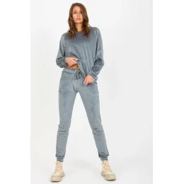Velurový komplet sestávající z halenky a dlouhých kalhot. Halenka s dlouhými rukávy a kulatým výstřihem. Dlouhé kalhoty se šňůrkou v pase a kapsami na bocích. Rukávy zdobené kamínkovým vzorem.