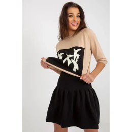 Tepláková souprava sestávající z halenky a sukně. Halenka s 3/4 rukávy a kulatým výstřihem. Ozdobný potisk na přední straně. Sukně s vyšším pasem, zapínání na zip a knoflík.