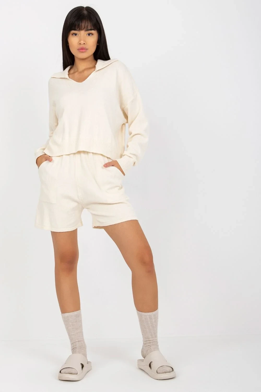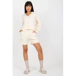Ležérní souprava sestávající z šortek a svetru. Volný svetr s dlouhými rukávy. Krátké šortky s pružným pasem a kapsami.