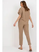 Letní souprava sestávající z halenky a kalhot. Halenka s krátkými rukávy a kulatým výstřihem. Dlouhé kalhoty s vysokým pasem, zavazováním v pase a nakládanými kapsami.