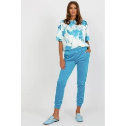 Velurová souprava sestávající z halenky a kalhot. Halenka s krátkými rukávy a kulatým výstřihem. Halenka z látky se zajímavým vzorem. Dlouhé kalhoty s vysokým pasem a nakládanými kapsami na bocích.