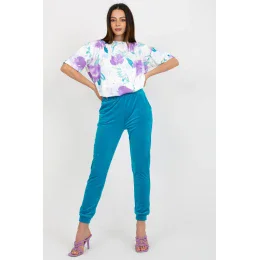 Velurová souprava sestávající z halenky a kalhot. Halenka s krátkými rukávy a kulatým výstřihem. Halenka z látky se zajímavým vzorem. Dlouhé kalhoty s vysokým pasem a nakládanými kapsami na bocích.