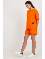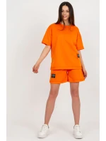 Bavlněná dámská souprava sestávající z halenky a šortek. Volná halenka s krátkými rukávy a kulatým výstřihem. Šortky se zavazováním v pase a nakládanými kapsami. Souprava s ozdobnými nášivkami.