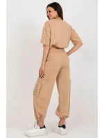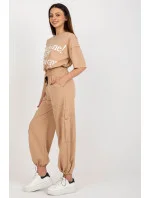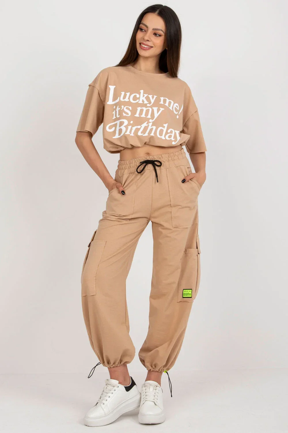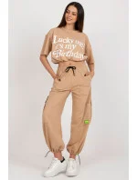 Tepláková souprava sestávající z halenky a kalhot. Halenka s krátkými rukávy a kulatým výstřihem, ozdobný nápis na přední straně. Dlouhé kalhoty se zavazováním v pase a nakládanými kapsami.