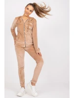 Velurová souprava sestávající z mikiny a dlouhých kalhot. Mikina s dlouhými rukávy a kapucí, zapínání na zip. Na přední straně jsou kapsy na druky. Dlouhé kalhoty se stahovací šňůrkou v pase a nakládanými kapsami na bocích.