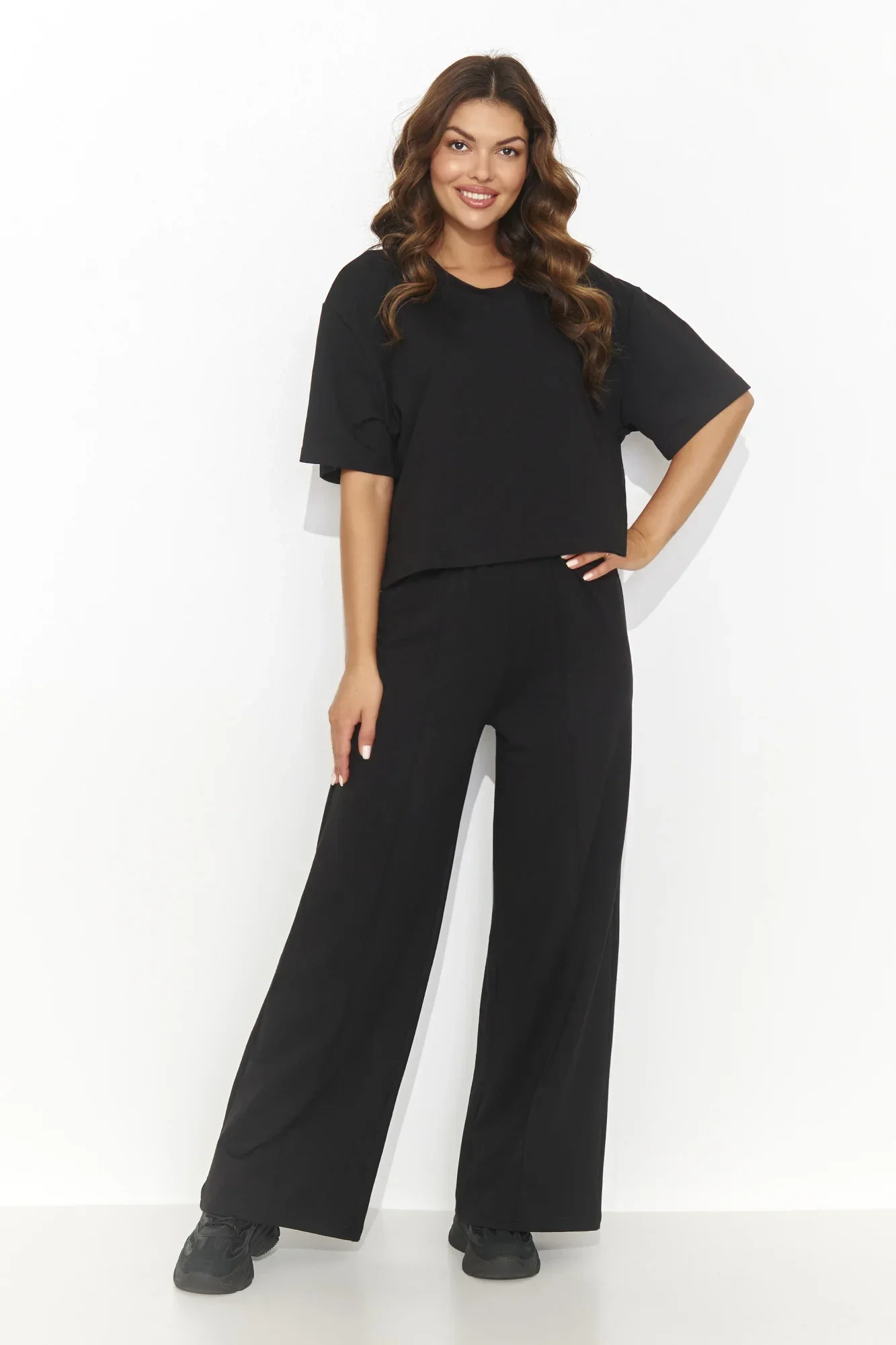 Tato stylová dámská tepláková souprava je kombinací pohodlí a elegance. Skládá se z ležérního trička s krátkým rukávem, které má na zádech nápadný výřez zdobený zlatou destičkou dodávající jemnou eleganci. Soupravu doplňují ležérní dlouhé kalhoty se širokými nohavicemi, které zdobí prošívání po celé délce pro moderní nádech. Souprava je k dispozici ve třech módních barvách, takže si můžete vybrat ten správný odstín podle svých preferencí. Je ideálním řešením pro ženy, které ocení stylové a pohodlné každodenní oblečení, ideální pro pohodový i aktivní životní styl.