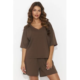 Tento lehký a vzdušný dámský komplet ušitý z jemného úpletu změní váš přístup k pohodlí. Halenka se srdíčkovým výstřihem, opatřená rozšířenými rukávy zdobenými elegantní halenkou. Díky volnému střihu halenky se pohodlně nosí, zatímco volné šortky s postranními kapsami jí dodávají uvolněný a sportovní styl. Tento komplet je ideální pro každodenní nošení, ať už na sportovní aktivity, setkání s přáteli nebo do práce. Je k dispozici v několika barvách, takže nabízí rozmanitost, která vyhoví vkusu každé ženy. Styl, pohodlí a modernost, vše, co potřebujete, v jednom kompletu.