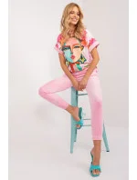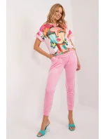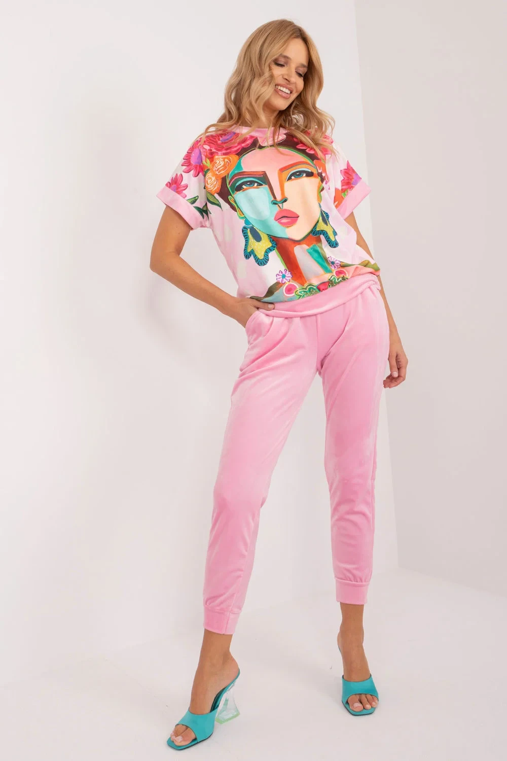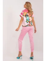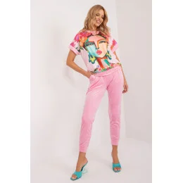 Tato velurová souprava je ideální pro ty, kteří si cení pohodlí a stylu na každý den. Skládá se z halenky a kalhot, které tvoří harmonickou dvojici ležérního vzhledu. Halenka, vyrobená z měkkého polyesteru, je opatřena potiskem, který jí dodává individuální nádech. Její krátké rukávy jí dodávají lehkost a ležérnost, ideální pro teplé dny. Kalhoty v jednobarevném provedení jsou dlouhé a pohodlné. Díky vysokému pasu se stahovací šňůrkou v pase se přizpůsobí siluetě pro pohodlné celodenní nošení. Boční nakládané kapsy jsou navíc praktickým prvkem pro bezpečné uložení drobných předmětů. Stahování nohavic na šňůrku dodává kalhotám ležérní vzhled a zároveň jim dodává nádech sportovního looku. Díky svému ležérnímu stylu se tato velurová souprava stane nezbytnou součástí vašeho každodenního šatníku a dodá pohodlí a styl v každé situaci.