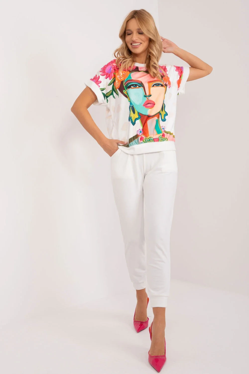 Tato velurová souprava je ideální pro ty, kteří si cení pohodlí a stylu na každý den. Skládá se z halenky a kalhot, které tvoří harmonickou dvojici ležérního vzhledu. Halenka, vyrobená z měkkého polyesteru, je opatřena potiskem, který jí dodává individuální nádech. Její krátké rukávy jí dodávají lehkost a ležérnost, ideální pro teplé dny. Kalhoty v jednobarevném provedení jsou dlouhé a pohodlné. Díky vysokému pasu se stahovací šňůrkou v pase se přizpůsobí siluetě pro pohodlné celodenní nošení. Boční nakládané kapsy jsou navíc praktickým prvkem pro bezpečné uložení drobných předmětů. Stahování nohavic na šňůrku dodává kalhotám ležérní vzhled a zároveň jim dodává nádech sportovního looku. Díky svému ležérnímu stylu se tato velurová souprava stane nezbytnou součástí vašeho každodenního šatníku a dodá pohodlí a styl v každé situaci.