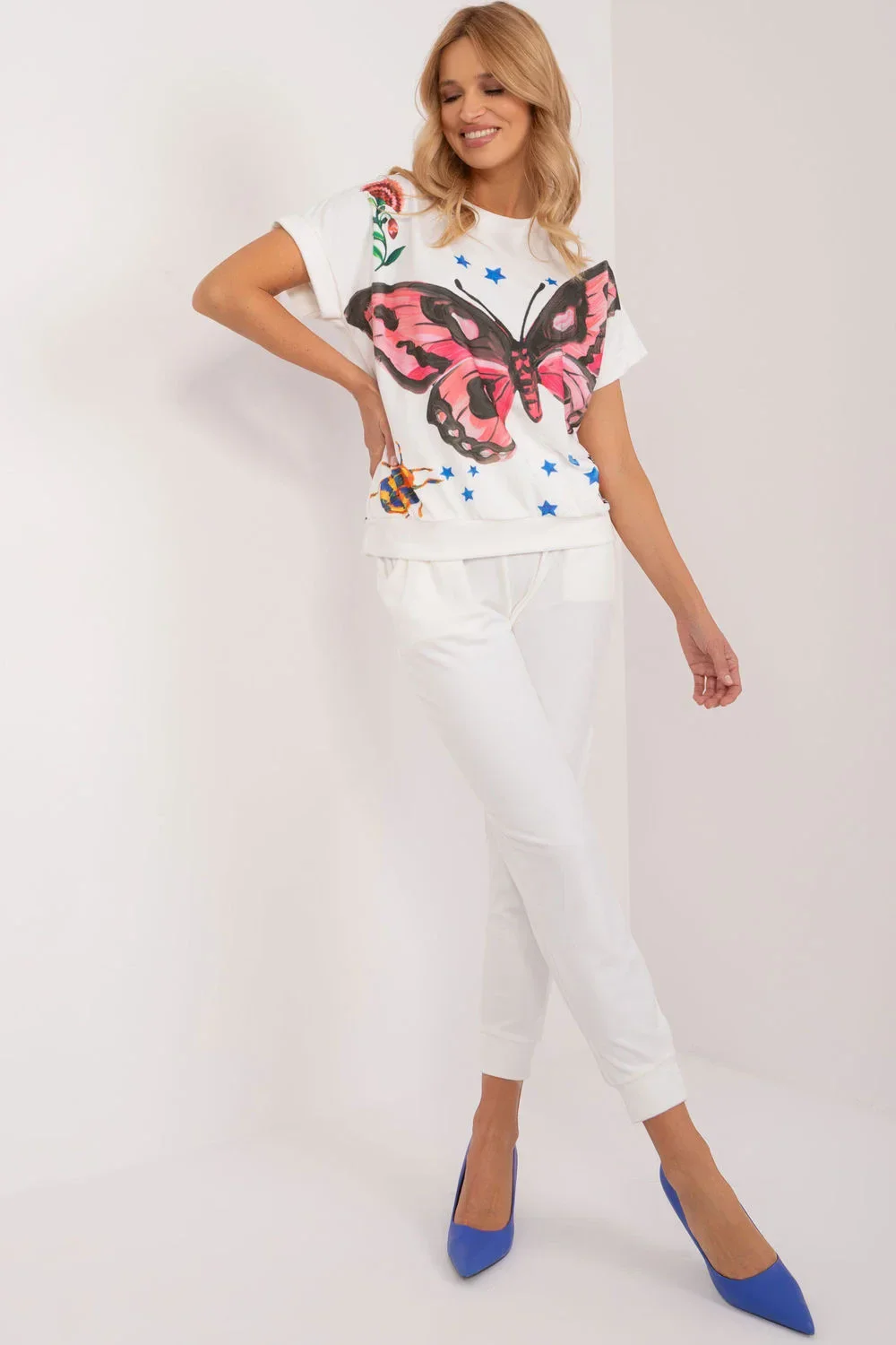 Tato velurová souprava je ideální pro ty, kteří si cení pohodlí a stylu na každý den. Skládá se z halenky a kalhot, které tvoří harmonickou dvojici ležérního vzhledu. Halenka, vyrobená z měkkého polyesteru, je opatřena potiskem, který jí dodává individuální nádech. Její krátké rukávy jí dodávají lehkost a ležérnost, ideální pro teplé dny. Kalhoty v jednobarevném provedení jsou dlouhé a pohodlné. Díky vysokému pasu se stahovací šňůrkou v pase se přizpůsobí siluetě pro pohodlné celodenní nošení. Boční nakládané kapsy jsou navíc praktickým prvkem pro bezpečné uložení drobných předmětů. Stahování nohavic na šňůrku dodává kalhotám ležérní vzhled a zároveň jim dodává nádech sportovního looku. Díky svému ležérnímu stylu se tato velurová souprava stane nezbytnou součástí vašeho každodenního šatníku a dodá pohodlí a styl v každé situaci.
