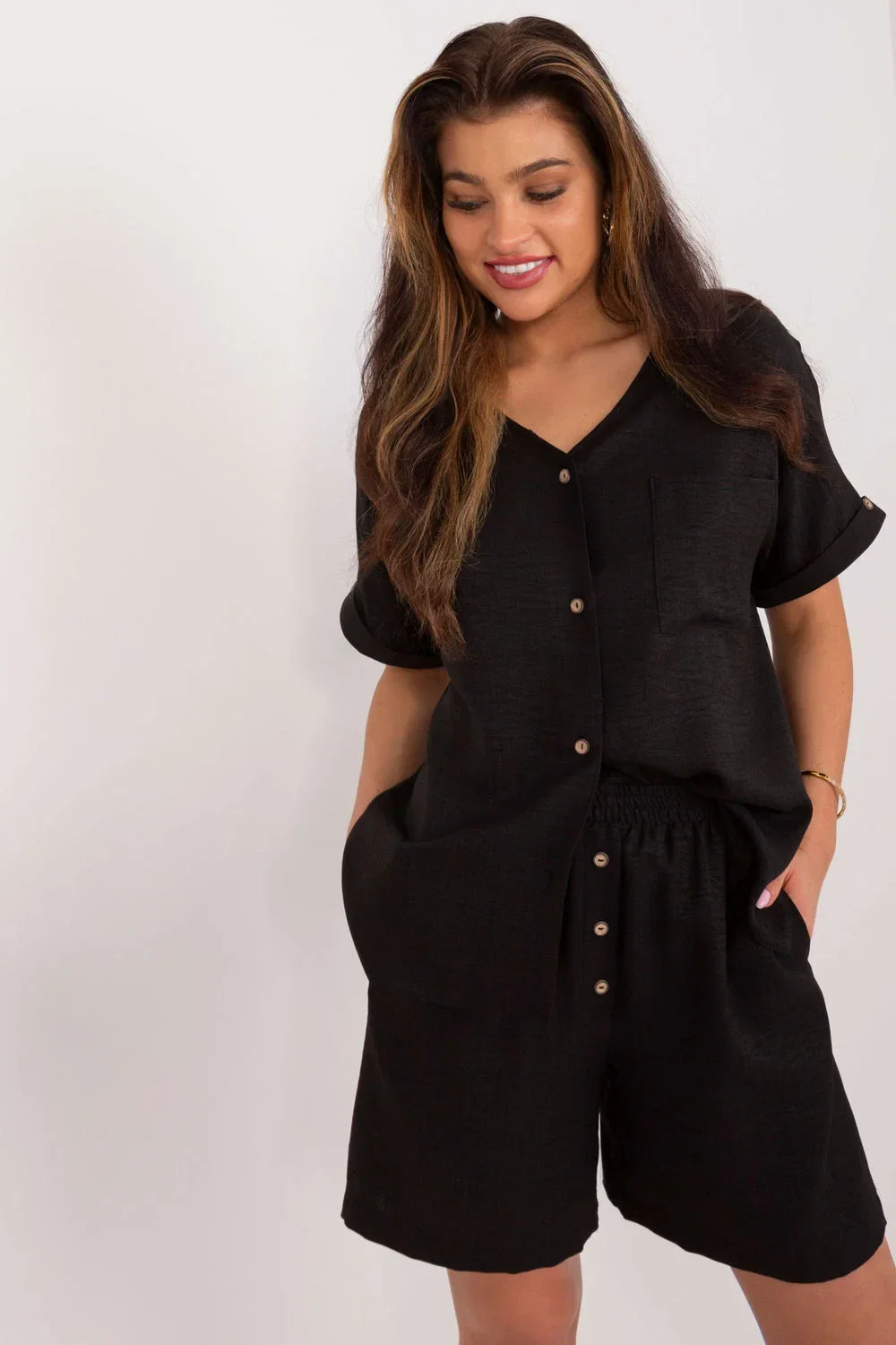 Tato elegantní a zároveň ležérní dámská souprava se skládá z trička a šortek a je ideální na každodenní vycházky. Hladký design a kombinace bavlny a polyesteru zajišťují pohodlí a trvanlivost. Šortky v délce ke kolenům se širokými nohavicemi a vysokým pasem zvýrazňují siluetu, zatímco boční kapsy dodávají praktičnost. Krátké rukávy a výstřih do V dodávají košili lehkost a letní styl, zatímco knoflíky na přední straně umožňují snadné oblékání. Jedná se o ideální volbu pro teplé dny, která kombinuje pohodlí a módní vzhled.