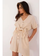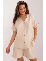 Tato elegantní a zároveň ležérní dámská souprava se skládá z trička a šortek a je ideální na každodenní vycházky. Hladký design a kombinace bavlny a polyesteru zajišťují pohodlí a trvanlivost. Šortky v délce ke kolenům se širokými nohavicemi a vysokým pasem zvýrazňují siluetu, zatímco boční kapsy dodávají praktičnost. Krátké rukávy a výstřih do V dodávají košili lehkost a letní styl, zatímco knoflíky na přední straně umožňují snadné oblékání. Jedná se o ideální volbu pro teplé dny, která kombinuje pohodlí a módní vzhled.