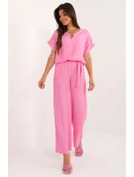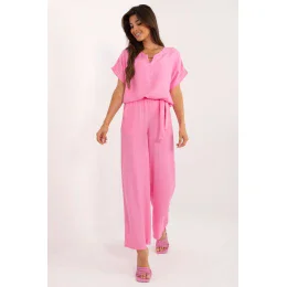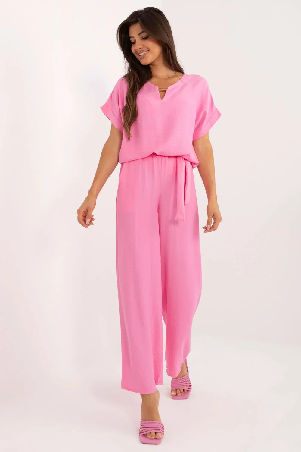 Tento ležérní komplet složený z halenky a kalhot je ideální volbou pro každodenní nošení i do práce. Je vyrobena z převažující viskózy a poskytuje pohodlí a prodyšnost po celý den. Hladký materiál v jednobarevném provedení dodává soupravě elegantní a zároveň ležérní vzhled. Halenka s krátkými rukávy a kulatým výstřihem se skvěle kombinuje s dlouhými kalhotami se širokými nohavicemi. Kalhoty s vysokým pasem zdůrazňují pas a pásek na zavázání dodává stylový nádech. Praktické postranní kapsy s patkou zvyšují funkčnost. Jedná se o všestranný komplet, který se skvěle hodí do kanceláře i na každodenní nošení.