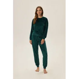 Pohodlí, volnost a móda, tato tři slova dokonale popisují sametový dresový set Fain. Jedná se o ženskou sadu, která se skládá z mikiny a dlouhých kalhot. Set je vyroben z příjemného sametového pletiva v módním tmavě zeleném odstínu. Pro lepší přizpůsobení se v pase nachází nekříživá guma a rukávy a nohavice jsou dokončeny pružnými lemy.
