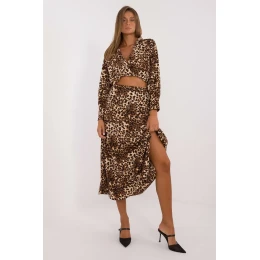 Modelka má na sobě velikost one size. Rozměry modelky: výška 176 cm, hrudník 85 cm, pas 64 cm, boky 92 cm. Rozměry kompletního setu v velikosti one size měřené na plocho: šířka blůzky pod pažemi - 51 cm, délka blůzky - 40 cm, délka rukávu - 55 cm, šířka sukně v pasu - 38 cm, délka sukně - 91 cm.