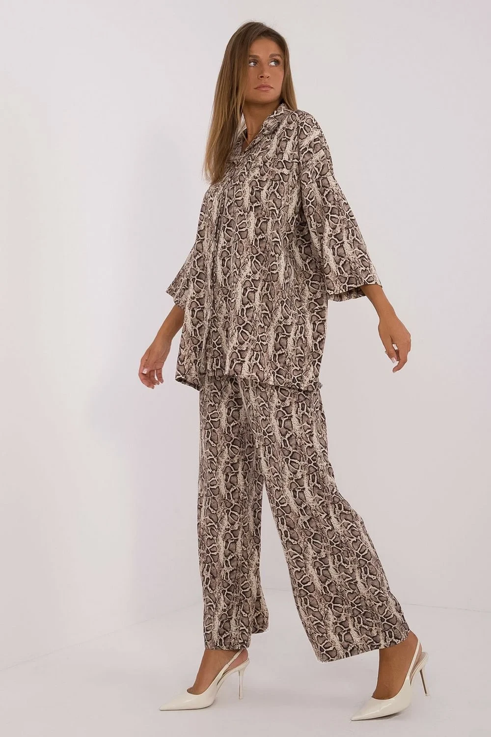 Sada skládající se z košile a kalhot, ideální pro každodenní příležitosti v casual stylu. Košile se zapíná na knoflíky, s rukávy délky 3/4 a klasickým límcem, co jí dodává univerzální charakter. Další výhodou je praktická kapsa na úrovni hrudníku. Kalhoty mají široké nohavice, co zajišťuje pohodlí a volnost pohybu, a díky elastickému pásku v pase se perfektně přizpůsobují siluetě, nabízejí pohodlné nošení po celý den. Sada je vyrobena z kombinace polyesteru a elastanu, co zaručuje lehkost, pružnost a trvanlivost materiálu. Dominantním vzorem je zvířecí motiv, který dodává celku módní a výrazný akcent. Košile a kalhoty jsou dlouhé, a kalhoty mají vysoký pas, co zdůrazňuje siluetu a dodává eleganci v každodenních stylizacích.