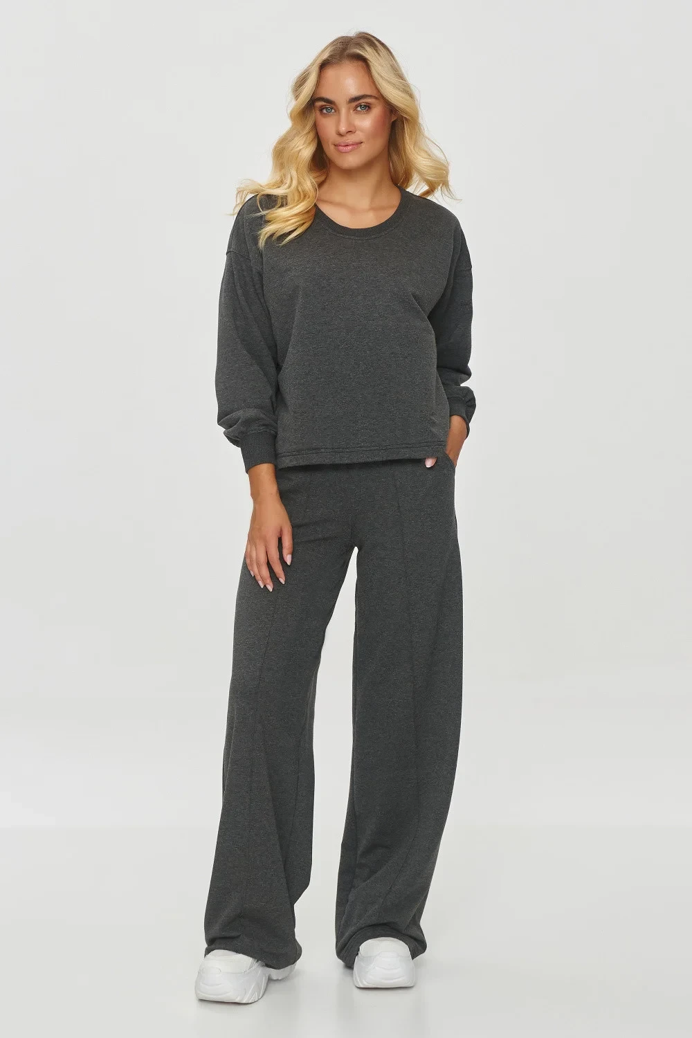 Dresová sada je ideální volbou pro lidi, kteří ocení pohodlí a styl v každodenních, neformálních stylizacích. Dres se skládá z volného svetru a širokých kalhot, což zajistí maximální pohodlí při nošení. Celá sada je vyrobena z měkkého, příjemného na dotek materiálu, který se ideálně hodí na chladnější dny. Svetr má klasický, jednoduchý střih s dlouhými rukávy a lehce spadajícím ramenem. Je dokončen kulatým výstřihem. Kalhoty mají široké nohavice, což dodá celé sestavě moderní, oversized charakter a švy podél nohavic opticky prodlužují nohy. Elastický pás v pasu zajišťuje pohodlné přizpůsobení. Tento set se ideálně hodí na každodenní výlety, nákupy nebo setkání s přáteli. Tato sada je spojením funkcionality a stylu, ideální pro lidi, kteří chtějí být pohodlní, aniž by se vzdali módního vzhledu.