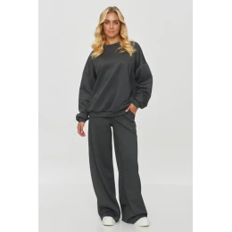 Pohodlný dresový set se skládá ze dvou částí: širokého svetru a volných kalhot. Svetr má oversize střih, který zajišťuje pohodlí a volnost pohybu. Má dlouhé rukávy, které jsou široké, a manžety jsou mírně zužované, což jí dodává více funkční, ale i originální vzhled. Spodek svetru je ukončen lemikem, který mírně modeluje siluetu, navzdory celkovému širokému střihu. Kalhoty mají volný střih, který ladí s oversize svetrem, tvoříce souvislý, relaxační set. Pas je elastický, takže se přizpůsobí siluetě a zvyšuje pohodlí nošení. Nohavice jsou široké a rovné, což dodává celku lehkost a modernost. Barva dresového setu je jednobarevná s jemným leskem, což zapadá do celkového elegantního, minimalistického vzhledu. Lze ji kombinovat se sportovními botami, které kontrastují s dresovým setem, přidávají celku svěžesti a sportovního charakteru. Jeho jednoduchý design a decentní barevnost ho činí univerzálním a stylovým.