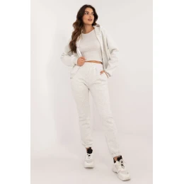 Dámská tepláková souprava ideální pro každodenní ležérní a sportovní styling, vyrobená ze směsi bavlny a elastanu. Souprava se skládá z krátkého trička na ramena, mikiny na zip s kapucí, dlouhými rukávy a nakládanými kapsami a kalhot s dlouhými nohavicemi a žebrovanými manžetami. Kalhoty mají vysoký náplet a boční kapsy pro větší pohodlí. Na zadní straně kalhot v úrovni hýždí je decentní potisk. Celkový design je zachován v melanžovém vzoru a dodatečné zateplení poskytuje pohodlí v chladnějších dnech. Jedná se o pohodlnou a stylovou volbu pro každodenní nošení.