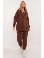 Zateplená dámská souprava v ležérním stylu, ideální pro chladnější dny a každodenní vycházky, se skládá z trička, mikiny a kalhot. Souprava se vyznačuje melanžovým vzorem, který jí dodává jedinečný nádech. Je vyrobena převážně z bavlny a poskytuje pohodlí a teplo, ideální pro podzimní a zimní dny. Kalhoty mají dlouhé nohavice s žebrovanými lemy a vysoký střih, který zvýrazňuje siluetu a zaručuje pohodlné nošení. V pase je stahovací šňůrka pro dokonalé přizpůsobení a zasouvací boční kapsy jsou praktickým řešením pro drobnosti. Mikina s dlouhým rukávem se zapíná do poloviny pomocí patentek, což jí dodává originalitu a usnadňuje oblékání. Má také kapuci a velkou klokaní kapsu, která dodává sportovní nádech a další funkčnost. Je doplněna klasickým tričkem, čímž vzniká pohodlný a stylový komplet, ideální pro každodenní styling v chladnějších dnech.