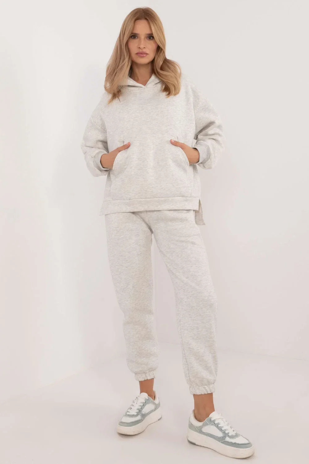 Zateplená dámská mikinová souprava pro volný čas, ideální pro každodenní chladnější dny, se skládá z mikiny a kalhot. Souprava je vyrobena z měkké a hřejivé směsi bavlny a polyesteru, která zajišťuje pohodlí a odolnost. Mikina má dlouhé rukávy, kapuci a velkou praktickou klokaní kapsu, která jí dodává sportovní nádech a funkčnost. Díky zateplení je mikina ideální pro chladné dny a její jednobarevný vzor jí dodává klasický, univerzální vzhled. Kalhoty s dlouhými nohavicemi zakončenými žebrovanými manžetami mají vysoký pas, který zvýrazňuje pas a zajišťuje pohodlí. V pase je umístěno zavazování pro dokonalé přizpůsobení. Kalhoty mají navíc zasouvací boční kapsy, takže jsou praktickou volbou pro každodenní nošení. Celá souprava v sobě spojuje styl, pohodlí a teplo a je ideální volbou pro ležérní styling.