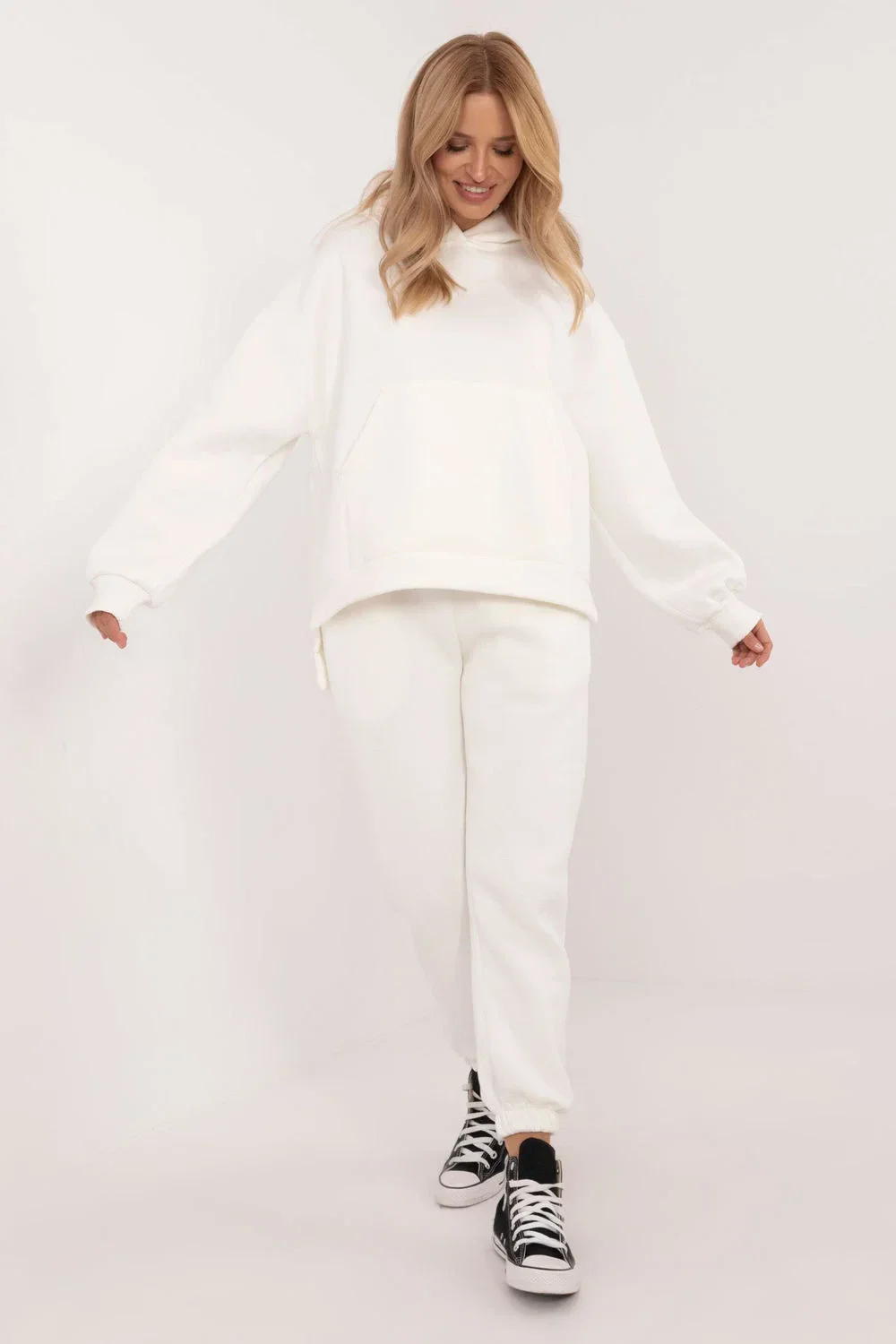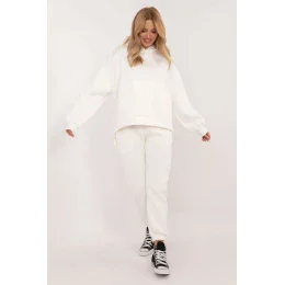 Zateplený dámský teplákový set ve casual stylu, ideální na každodenní chladnější dny, se skládá z mikiny a kalhot. Set je vyrobený z měkké a teplé směsi bavlny a polyesteru, co zajišťuje pohodlí a odolnost. Mikina má dlouhý rukáv, kapuci a velkou praktickou kapsu typu klokánek, která dodává sportovní akcent a funkcionalitu. Díky zateplení je mikina ideální na studené dny a její hladký vzor dodává klasický a univerzální vzhled. Kalhoty s dlouhými nohavicemi zakončenými manžetami mají vysoký pas, který zdůrazňuje pas a zajišťuje pohodlí. V pasu je šňůrka, která umožňuje ideální přizpůsobení. Navíc mají kalhoty boční kapsy, což z nich činí praktickou volbu na každý den. Celý set spojuje styl, pohodlí a teplo, což ho činí skvělou volbou pro casual outfit.
