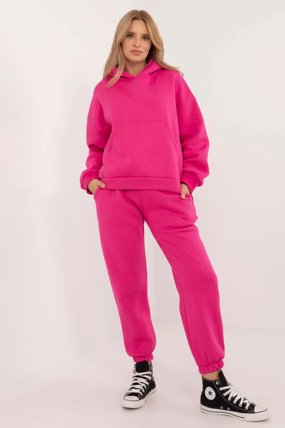 Zateplený dámský teplákový set v casual stylu, ideální na každý den, chladnější dny, se skládá z mikiny a kalhot. Set je vyroben z měkké a teplé směsi bavlny a polyesteru, co zajišťuje pohodlí a odolnost. Mikina má dlouhý rukáv, kapuci a velkou praktickou kapsu typu klokánek, která dodává sportovní akcent a funkčnost. Díky zateplení je mikina ideální na chladné dny a její hladký vzor dodává klasický univerzální vzhled. Kalhoty s dlouhými nohavicemi zakončenými manžetami mají vysoký pas, který zdůrazňuje pas a zajišťuje pohodlí. V pase je šňůrka, která umožňuje ideální přizpůsobení. Navíc mají kalhoty boční kapsy, což z nich činí praktickou volbu na každý den. Celý set spojuje styl, pohodlí a teplotu, což je skvělá volba pro casual stylizace.