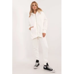 Dámský sportovní komplet v casual stylu, ideální na každodenní nošení, se skládá z mikiny a kalhot. Vyrobený z směsi bavlny a elastanu, poskytuje pohodlí, měkkost a volnost pohybu díky elastickým vlastnostem materiálu. Mikina má dlouhý rukáv, zapíná se na zip a má na přední straně nášivky kapes, co jí dodává praktičnost a sportovní styl. Mikina má také kapuci, která poskytuje další ochranu proti chladu a hladký vzor dává outfitu klasický a stylový vzhled. Kalhoty s dlouhými nohavicemi zakončenými manžetami mají vysoký pas, který zdůrazňuje siluetu a zaručuje pohodlné přizpůsobení. V pasu je elastický pásek, který poskytuje komfort a ideální držení kalhot. Postranní kapsy v kalhotách jsou praktické a funkční. Tento komplet je kombinací pohodlí, stylu a praktičnosti, ideální na každodenní volné outfity.