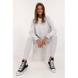 Dámská souprava sestávající z legín a mikiny, ideální pro každodenní ležérní styling. Je vyrobena z vysoce kvalitní bavlny s přídavkem elastanu a zajišťuje pohodlné nošení a přiléhavý střih. Legíny se zúženými nohavicemi, žebrovaným materiálem a vysokým pasem zvýrazňují postavu a zároveň nabízejí pohodlí a volnost pohybu. Mikina s dlouhými rukávy a kulatým výstřihem má na přední straně vyražený obrázek, který soupravě dodává originální nádech. Hladký vzor dominuje celému kompletu, takže je univerzální volbou pro každou každodenní příležitost.