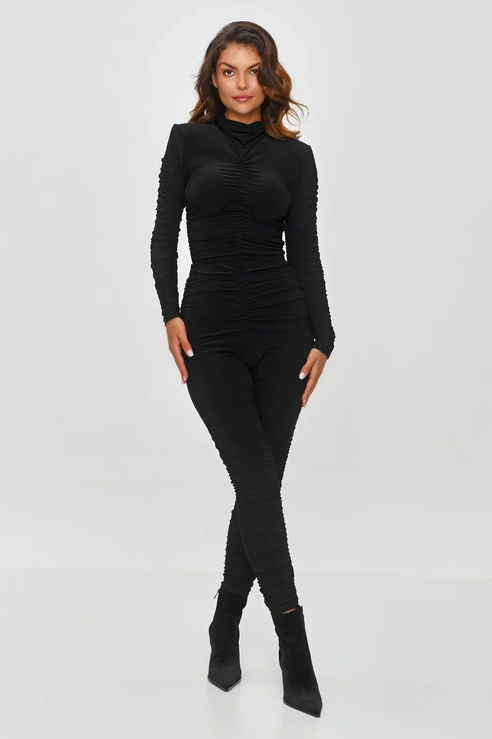 Elegantní černý komplet s elegantním, přiléhavým střihem. Blůza má dlouhé rukávy a vysoký výstřih, co dodává celku sofistikovaný a bohatý vzhled. Přechodný šev vpředu a vzadu vytváří záhyby, co přidává texturu a efektně modeluje postavu. Nohavice jsou zúžené, zdůrazňující přiléhavý vzhled a moderní styl. Hladký materiál s lehkým leskem dodává záři a hodí se vždy a všude. Střih tohoto modelu zdůrazňuje pas a přidává smyslnost celému outfitu. Dámský komplet přizpůsobený tvaru postavy vyvolá ty nejskrytější zásoby sexepilu a sebejistoty. Skvělý pro odvážné ženy a pravé fashionistky.