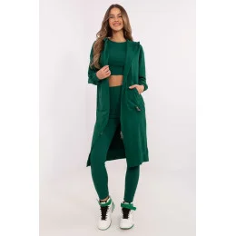 Dámský set skládající se z mikiny, topu a legín je harmonické spojení casualového a sportovního stylu. Vytvořen s ohledem na každodenní pohodlí a aktivitu, skvěle poslouží jak při cvičení, tak během relaxace. Mikina s prodlouženým střihem je praktickým řešením pro chladnější dny. Zapíná se na zip a je vybavena vloženými kapsami, což zajišťuje pohodlí a funkčnost. Vyrobená z kombinace bavlny, polyesteru a elastanu spojuje měkkost s pružností. Dlouhý rukáv a kapuce navíc chrání před větrem a chladem. Top s kulatým výstřihem je jednoduchý, ale zároveň univerzální, ideálně padne k celému setu. Jeho složení z bavlny a elastanu zaručuje prodyšnost a pohodlí nošení. Legíny se zužujícími se nohavicemi a vysokým pasem zdůrazňují postavu, zároveň zajišťují plnou volnost pohybu. Vyrobené z bavlny a elastanu se vyznačují pružností a odolností. Dalším výrazným prvkem je pruhovaná struktura materiálu, která jim dodává jedinečný charakter. Celkový hladký vzor se skvěle hodí k každodennímu sportovnímu vzhledu, nabízí styl i maximální pohodlí užívání.