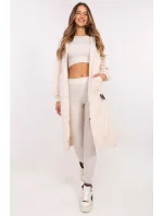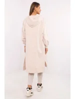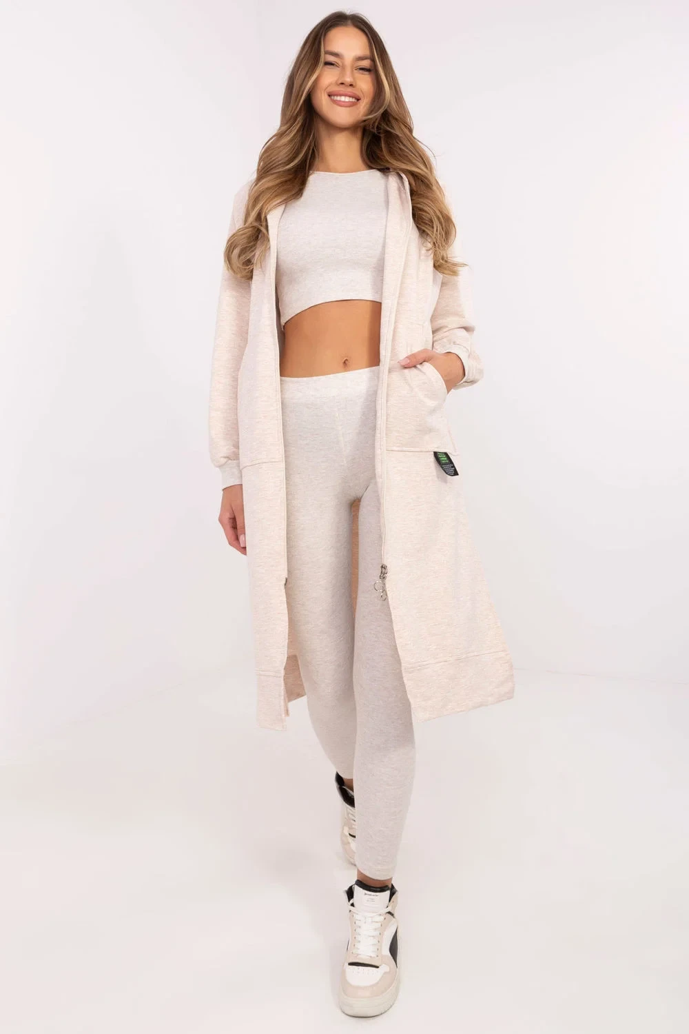 Dámský set skládající se z mikiny, topu a legín je harmonické spojení casual a sportovního stylu. Vytvořen s ohledem na každodenní pohodlí a aktivitu, skvěle poslouží jak při cvičení, tak při relaxaci. Mikina s prodlouženým střihem je praktickým řešením pro chladnější dny. Zapíná se na zip a je vybavena kapsami, co zajišťuje pohodlí a funkčnost. Vyrobená ze směsi bavlny, polyesteru a elastanu spojuje měkkost s pružností. Dlouhý rukáv a kapuce dále chrání před větrem a chladem. Top s kulatým výstřihem je jednoduchý a zároveň univerzální, ideální pro celý set. Jeho složení z bavlny a elastanu zaručuje prodyšnost a pohodlí nošení. Legíny se zužujícími se nohavicemi a vysokým pasem zdůrazňují postavu a zároveň poskytují plnou volnost pohybu. Vyrobené z bavlny a elastanu jsou elastické a odolné. Dalším rozlišovacím prvkem je proužkovaná struktura materiálu, která jim dodává výjimečný charakter. Celkově laděný v hladkém vzoru se skvěle hodí do každodenního sportovního vzhledu, nabízející jak styl, tak maximální pohodlí při nošení.