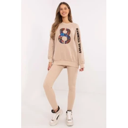 Dámský set skládající se z mikiny a legín je skvělým návrhem na každodenní, neformální stylizace. Ideální pro ženy, které ocení pohodlí a zároveň chtějí vypadat módně a stylově. Mikina klasického střihu s kulatým výstřihem a dlouhým rukávem je vyrobena z vysoce kvalitní směsi bavlny, polyesteru a elastanu. Je příjemná na dotek, elastická a odolná, což zajišťuje pohodlí při nošení po celý den. Subtilní nášivky a vyšívání na rukávu a přední části jí dodávají zvláštní charakter, zdůrazňující moderní design. Legíny se zúženými nohavicemi a vysokým pasem jsou ideálním doplňkem k setu. Vyrobené z bavlny s příměsí elastanu se perfektně přizpůsobují postavě, poskytují plnou volnost pohybu a pohodlí. Celý set je v hladkém vzoru, což ho činí univerzálním a snadno kombinovatelným s různými doplňky. Skvělá volba na každodenní vycházky, relaxaci nebo aktivity v uvolněném stylu. Složení materiálu: Mikina: 72 % bavlna, 22 % polyester, 6 % elastan Legíny: 90 % bavlna, 10 % elastan