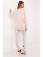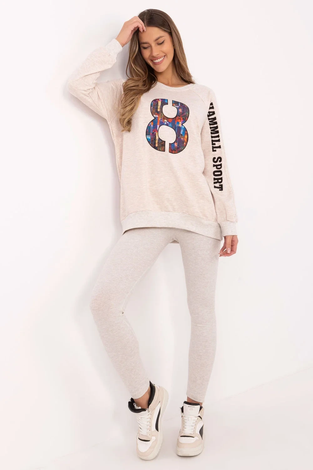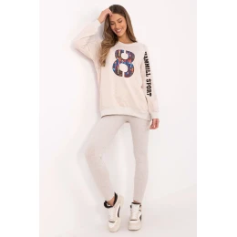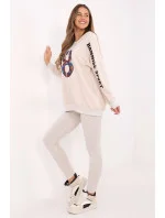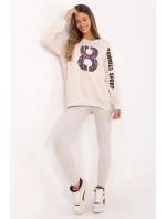 Dámský set skládající se z mikiny a legín je skvělou nabídkou pro každodenní, casual stylizace. Ideální pro ženy, které ocení pohodlí a zároveň chtějí vypadat módně a stylově. Mikina v klasickém střihu s kulatým výstřihem a dlouhým rukávem je vyrobena z vysoce kvalitní směsi bavlny, polyesteru a elastanu. Je příjemná na dotek, elastická a odolná, což zajišťuje pohodlí po celý den. Jemné nášivky a vyšívané detaily na rukávu a přední části dodávají mikině výjimečný charakter a zdůrazňují moderní design. Legíny se zúženými nohavicemi a vysokým pasem jsou ideálním doplňkem sady. Vyrobena z bavlny s příměsí elastanu, perfektně padnou ke figuře, poskytují plnou volnost pohybu a pohodlí. Celkový jednobarevný vzor dělá set univerzálním a snadno kombinovatelným s různými doplňky. Je to perfektní volba pro každodenní vycházky, relaxaci nebo volnočasové aktivity v uvolněném stylu. Složení materiálu: Mikina: 72% bavlna, 22% polyester, 6% elastan Legíny: 90% bavlna, 10% elastan