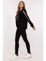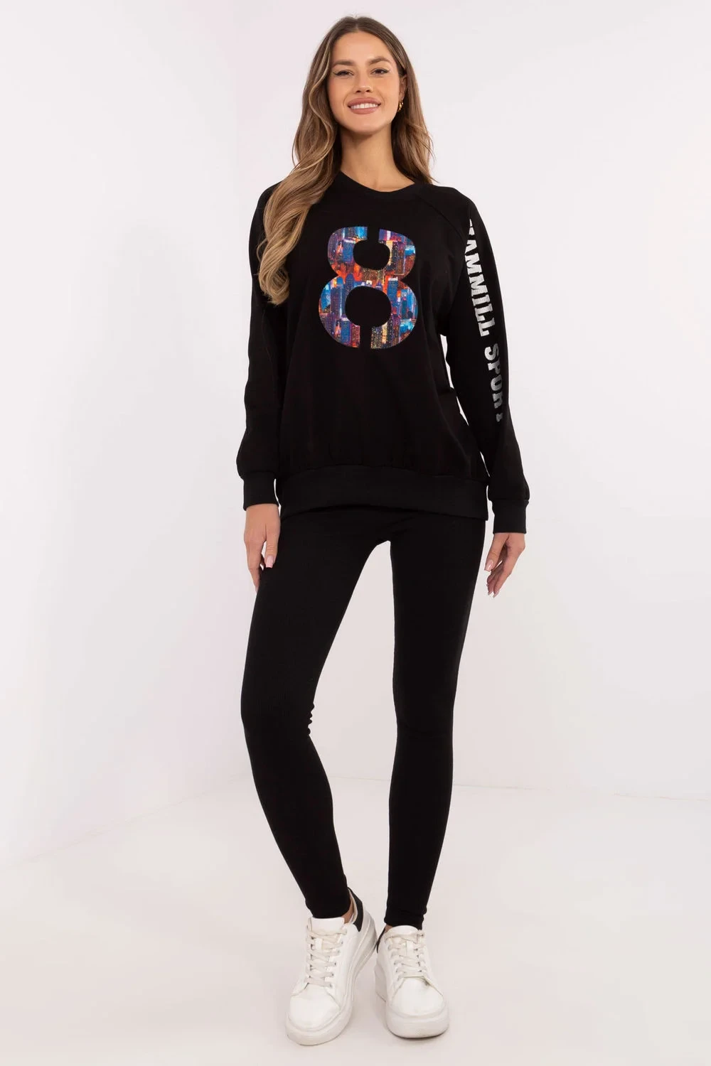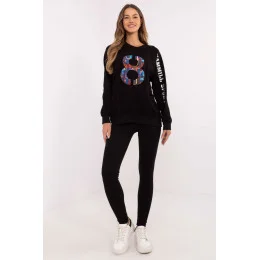 Dámský set skládající se z mikiny a legín je skvělý návrh pro každodenní, ležérní stylizace. Ideální pro ženy, které ocení pohodlí a zároveň chtějí vypadat módně a stylově. Mikina s klasickým střihem s kulatým výstřihem a dlouhým rukávem je vyrobena z vysoce kvalitní směsi bavlny, polyesteru a elastanu. Je příjemná na dotek, elastická a odolná, což zaručuje pohodlí během celého dne. Jemné aplikace a vyšívání na rukávu a přední části jí dodávají výjimečný charakter, zdůrazňující moderní design. Legíny s sevřenými nohavicemi a vysokým pasem jsou ideálním doplňkem setu. Vyrobena z bavlny s příměsí elastanu se perfektně přizpůsobí postavě, poskytující plnou volnost pohybu a pohodlí. Celkový vzhled je udržován v hladkém vzoru, což činí set univerzálním a snadno kombinovatelným s různými doplňky. Je to dokonalá volba na každodenní vycházky, relaxaci nebo aktivity v uvolněném stylu. Složení materiálu: Mikina: 72% bavlna, 22% polyester, 6% elastan Legíny: 90% bavlna, 10% elastan