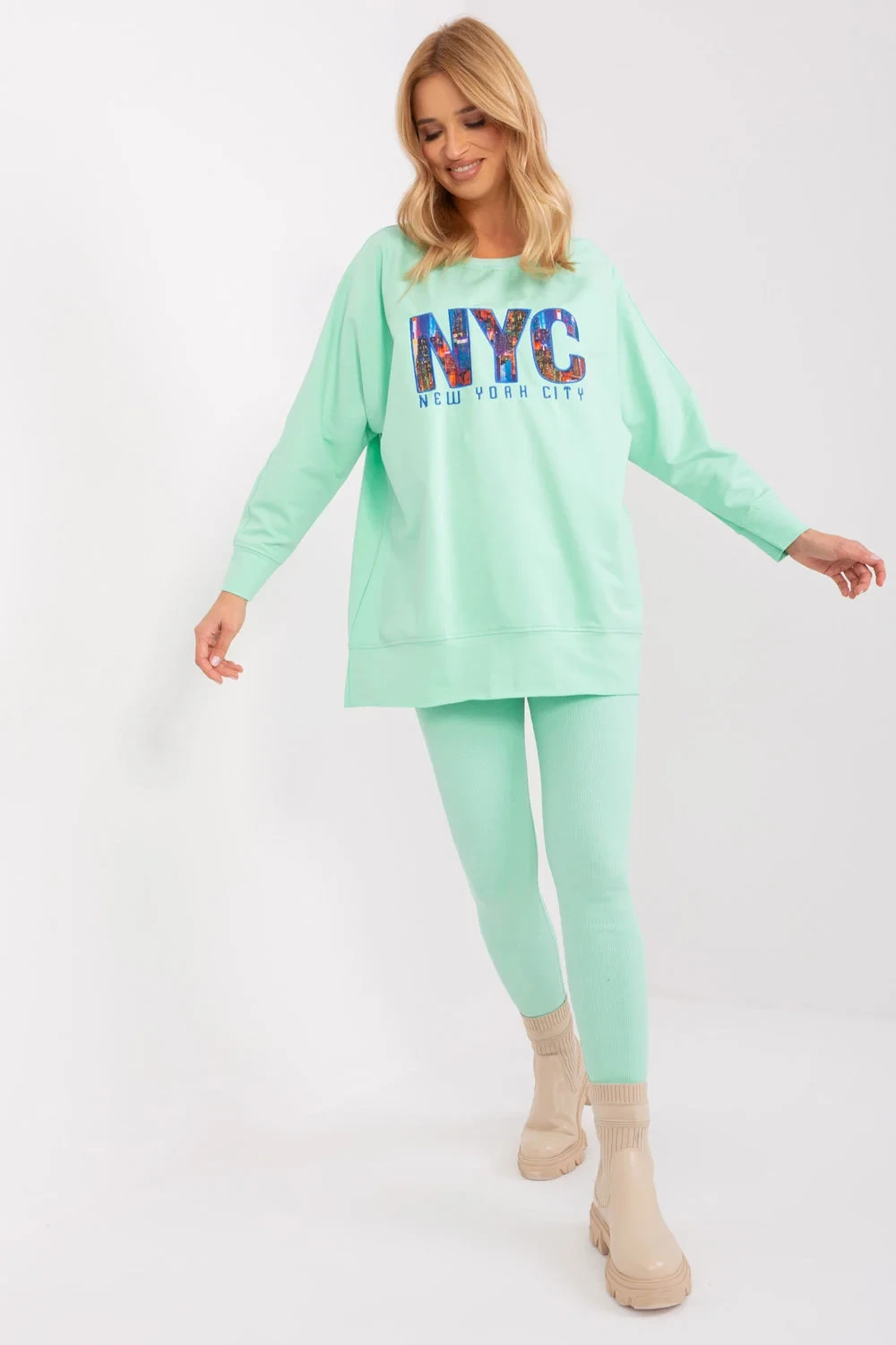 Dámská souprava sestávající z mikiny a legín je dokonalou kombinací pohodlí a stylu. Mikina má na přední straně potisk, který jí dodává jedinečný charakter a podtrhuje moderní design. Je vyrobena ze směsi vysoce kvalitní bavlny, polyesteru a elastanu, takže poskytuje pohodlí a odolnost. Legíny se vyznačují vysokým pasem, který dokonale zvýrazňuje pas a zajišťuje pohodlí při každodenních aktivitách. Zúžené nohavice dokonale padnou, zatímco žebrovaná tkanina dodává jemnou strukturu a módní vzhled. Souprava je ideální pro každodenní výlety, procházky nebo chvíle odpočinku doma. Díky kombinaci univerzálního stylu a funkčnosti je skvělou volbou pro všechna roční období.