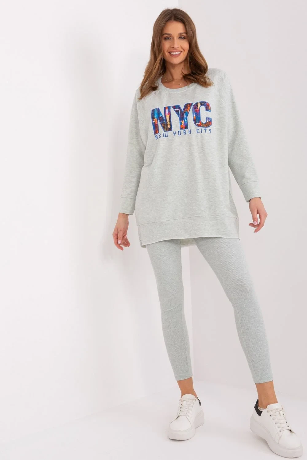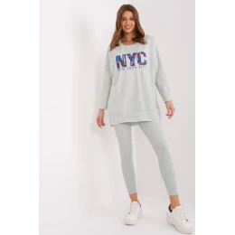 Dámská souprava sestávající z mikiny a legín je dokonalou kombinací pohodlí a stylu. Mikina má na přední straně potisk, který jí dodává jedinečný charakter a podtrhuje moderní design. Je vyrobena ze směsi vysoce kvalitní bavlny, polyesteru a elastanu, takže poskytuje pohodlí a odolnost. Legíny se vyznačují vysokým pasem, který dokonale zvýrazňuje pas a zajišťuje pohodlí při každodenních aktivitách. Zúžené nohavice dokonale padnou, zatímco žebrovaná tkanina dodává jemnou strukturu a módní vzhled. Souprava je ideální pro každodenní výlety, procházky nebo chvíle odpočinku doma. Díky kombinaci univerzálního stylu a funkčnosti je skvělou volbou pro všechna roční období.