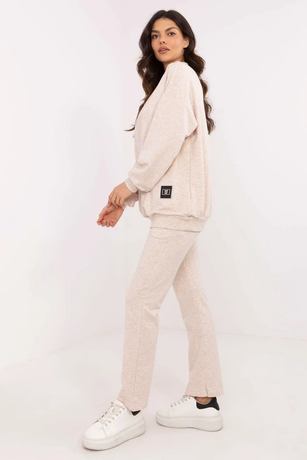 Tento dámský set je ideální volbou pro každodenní nošení, kombinuje pohodlí s minimalistickým stylem. Skládá se z mikiny s dlouhým rukávem a přesýpacím výstřihem do srdce, který dodává celku ženský akcent. Jemná nášivka na mikině představuje módní detail, který přitahuje pozornost. Kalhoty s jednoduchým střihem, s vysokým pasem a širokým elastickým pásem, zajistí dokonalé padnutí a pohodlí nošení. Postranní kapsy jsou nejen praktické, ale také zdůrazňují volný charakter setu. Celkově vyrobeno z měkké směsi bavlny, elastanu a polyesteru, což zaručuje pohodlí a odolnost. Set se skvěle hodí na procházky, nákupy nebo relaxaci doma, a jeho univerzální design umožňuje snadné sladění s různými příležitostmi.