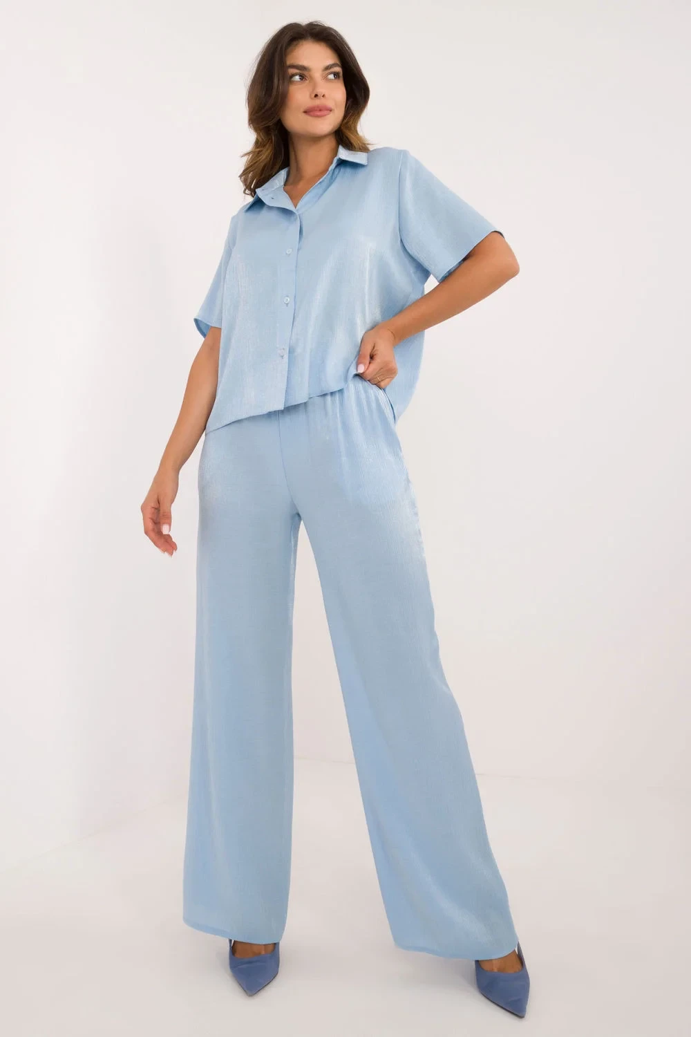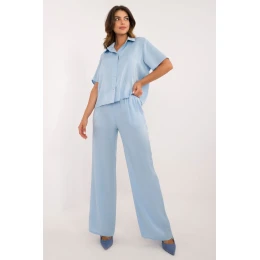 Elegantní dámský set, který spojuje klasický styl s pohodlím. Vyrobený z vysoce kvalitní směsi bavlny, elastanu a viskózy, zajistí pohodlí nošení a skvělé přizpůsobení postavě. Hladký materiál mu dodává univerzální charakter, což z něj činí skvělou volbu jak na běžné nošení, do práce, tak i na formální příležitosti. Košile s delším střihem a krátkým rukávem má klasický límeček a knoflíky, zatímco doplňkové vázání v pase jemně zdůrazní pas. Kalhoty s vysokým pasem a širokými nohavicemi zaručují volnost pohybu, zatímco boční kapsy přidávají funkčnost. Ideální volba pro ženy, které ocení eleganci a pohodlí ve svých každodenních stylizacích!