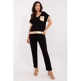 Elegantní a pohodlný dámský set je skvělou volbou jak do práce, tak na běžné nošení. Skládá se z kraťasy s krátkým rukávem a výstřihem do V a kalhot s vysokým pasem, které zajistí pohodlí a stylový vzhled. Model je zdoben zlatými detaily na kapse na hrudi, na manžetách a pasu, které dodávají celku jemnou eleganci. Šňůrka v pase umožňuje ideální přizpůsobení siluetě a boční vložené kapsy zvyšují funkčnost. Vyrobený z příjemné směsi viskózy, bavlny a elastanu, set se skvěle přizpůsobí tělu a zajistí pohodlí po celý den. Hladký vzor a rovné nohavice dělají z tohoto setu univerzální kousek, který se skvěle doplňuje s různými doplňky.