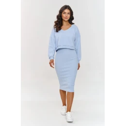 Tento teplák je nabídkou pro ženy, které ocení styl s nádechem pohodlí. Jednoduchý střih a univerzální forma šatů dokonale zdůrazní siluetu. Díky žebrované struktuře materiálu je zároveň elastická a kompaktní, poskytující plnou volnost pohybu. Midi délka je klasikou módy, která navíc zdůrazňuje eleganci a nikdy nevyjde z módy. Volný střih mikiny a výstřih ve tvaru písmene V jí dodávají volný, ale stylový charakter. Rukávy s elastickými manžetami umožňují regulaci délky a krátký střih ideálně ladí se šaty, dodávajíce jim lehkost. Volná mikina a přiléhavé šaty vytvářejí módní, ale praktický vzhled, který se hodí jak na každodenní setkání, tak na relaxační dny doma.