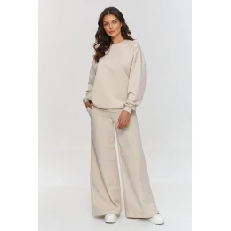 Tento teplákový set je ideální volbou pro ženy, které ocení funkčnost a styl. Sestava se skládá z oversized mikiny s dlouhými rukávy a volných kalhot, které vytvářejí pohodlný, ale stylový celek. Díky širokému střihu kalhoty poskytují plnou volnost pohybu a elastický pas se přizpůsobí postavě. Navíc jsou rozšiřovány ke spodu, což dává sestavě výjimečný a dynamický charakter. Mikina s klasickým kulatým výstřihem a rukávy zakončené pružnými lemy doplňují celek, vytvářejí pohodlný a zajímavý set. Teplákový oblek je vyroben z měkkého a příjemného materiálu, který zaručuje pohodlí každý den. Díky jednoduchému, ale efektnímu střihu se sestava skvěle hodí do různých situací. Náš teplákový set spojuje pohodlí, funkčnost a moderní vzhled. Hodí se jak na odpočinek doma, tak na setkání s přáteli, nákupy nebo do práce. Set skvěle ladí s oblíbenými teniskami, tvoří stylovou, pohodlnou a módní stylizaci.