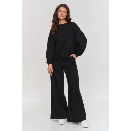 Tento teplák je ideální volbou pro ženy, které ocení funkčnost a styl. Sada se skládá z oversized mikiny s dlouhými rukávy a volných kalhot, které vytvářejí pohodlný, ale stylový celek. Díky širokému střihu kalhoty poskytují plnou volnost pohybu a elastický pas se přizpůsobuje postavě. Navíc jsou rozšiřovány ke dnu, což dává sadě výjimečný a dynamický charakter. Mikina s klasickým kulatým výstřihem a rukávy s pružnými lemy doplňují celek, vytvářejí pohodlnou a zajímavou sadu. Tepláky jsou vyrobeny z měkkého a příjemného materiálu, který zajišťuje pohodlí každý den. Díky jednoduchému, ale efektnímu střihu se sada skvěle hodí do různých situací. Naše tepláková sada spojuje volnost, funkčnost a moderní vzhled. Hodí se jak na odpočinek doma, tak na setkání s přáteli, nákupy nebo do každodenního života. Sada skvěle ladí s oblíbenými teniskami, vytvářející stylové, pohodlné a módní outfit.